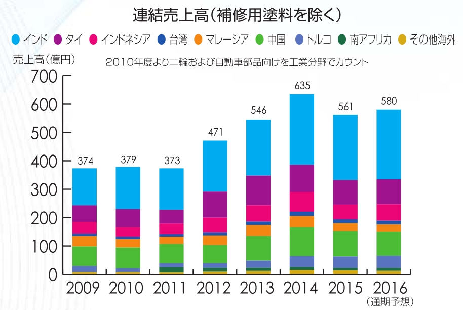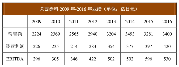 根据《涂界》发布的“201年世界十大涂料制造商排行榜”显示,日本关西涂料以2015年度销售额29.203亿美元,位居第9位,高于排名第10位的亚洲涂料集团(销售额为22.16亿美元)。