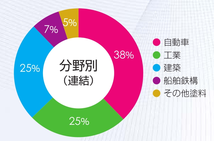 按业务类来看,汽车漆占38 %,工业漆占25%,船舶漆占7%,建筑涂料占25%,其他涂料占5%。