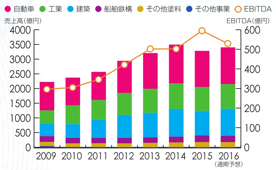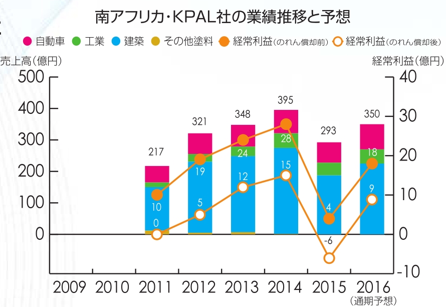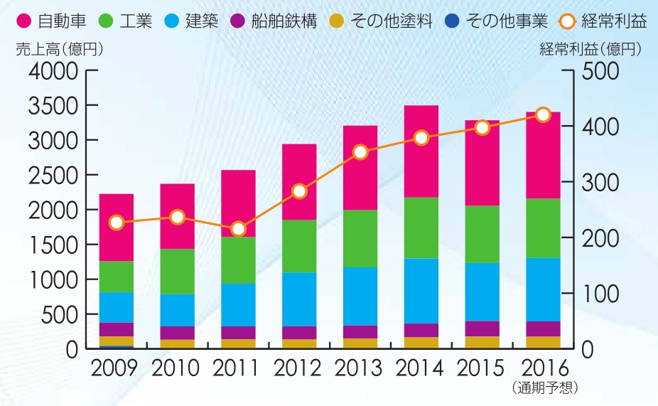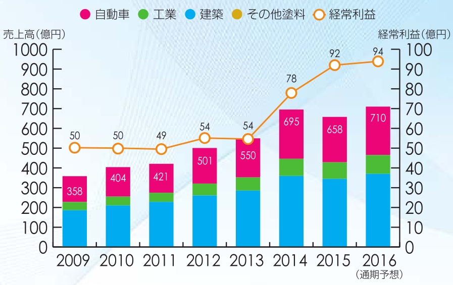 对未来业绩规划,关西涂料提出要扩大事业的规模和强化收益性并存。预计,2016财年将实现销售额3400亿日元,同比增长3.5%;经营利润达420亿日元,同比增长5.48%。到2018财年,将实现销售额达4200亿日元,约37.38亿美元(以现有汇率计算);经营利润为600日元。