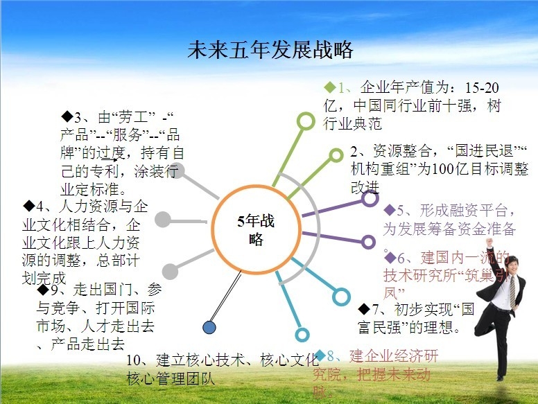 润南集团实施未来五年发展战略,其中包括:企业年产值为15亿元-20亿元,中国同行业前十强,树行业典范;资源整合,“国进民退”“机构重组”为100亿目标调整改进,等。