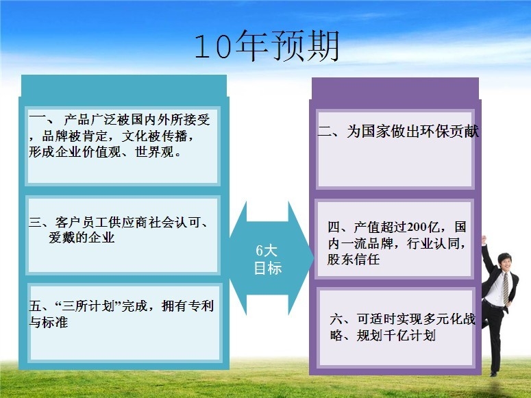 此外,润南集团还对未来10年进行了规划,要完成6大目标,其中包括产值超过200亿元,国内一流品牌,行业认同,股东信任;可适时实现多元化战略、规划千亿计划。此外,润南集团未来20年规划,其中包括:千亿企业,利税近百亿,解决4-6万人的就业。(涂界)