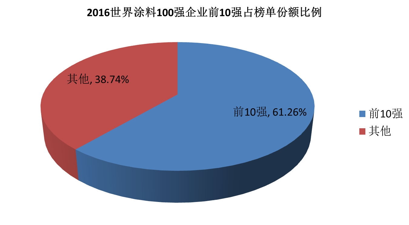 从经营收入来看,世界涂料100强企业累计销售额为1015.2亿美元,占全球涂料总销售额的53.07%;世界前10强涂料企业累计销售额为621.917亿美元,占全球涂料销售总额的32.51%,占榜单总销售额的61.26%。