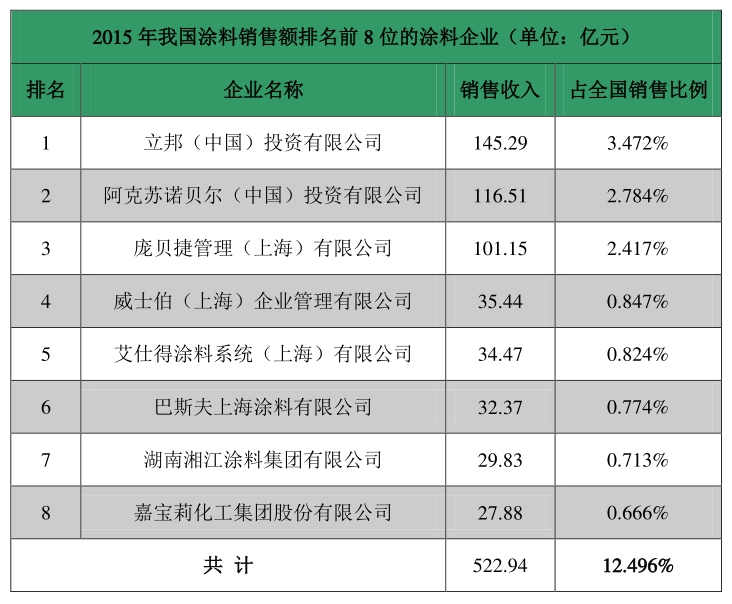 2015年我国涂料前10强企业(按销售收入排名)分别是立邦、阿克苏诺贝尔、PPG、威士伯、艾仕得、巴斯夫、湘江、嘉宝莉、海虹老人、佐敦。按综合销售收入排名的前十名企业收入总和为573.06亿元,占全国销售收入比例为13.69%。