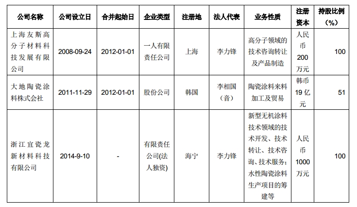 上海宜瓷龙新材料科技有限公司,成立于2010年,2014年9月23日完成股份制改造,主营业务为:在新型无机涂料技术领域内的技术开发、技术转让、技术咨询、技术服务,水性陶瓷涂料等新型无机涂料的生产、销售,从事货物及技术的进出口业务。主要产品为具有耐高温、耐腐蚀、耐刮磨、防火阻燃性、耐污性、健康环保、多色彩等特性的高性能陶瓷涂料,产品广泛应用于食品工业、普通工业和建材产业。公司2012年、2013年和2014年1-6月营业收入分别为 6736.637万元、6835.028万元、2418.045万元,净利润分别为1548.771万元、1760.315万元、432.790万元。
