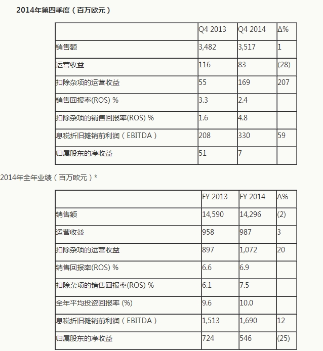 扣除杂项的运营收益达10.72亿欧元(2013年为8.97亿欧元),增幅20%。这是由于持续不断的运营效益提升举措和重组开支的减少带来了更高的收益,但被增加的杂项支出所抵消。2013年杂项收益达0.61亿欧元,主要是得益于剥离业务的收益,而2014年的0.85亿杂项开支,主要用于解决一些遗留项目,包括:在美国我们的一家分公司遭受到的外部欺诈事件,以及一项业务剥离相关的项目性开支。归属股东的净收益达5.46亿欧元(2013年计算特殊项目在内为7.24亿欧元)。2014年全年销售额下降2%,尽管所有业务领域的销量均上升1%,但被不利的汇率影响和业务剥离所抵消。