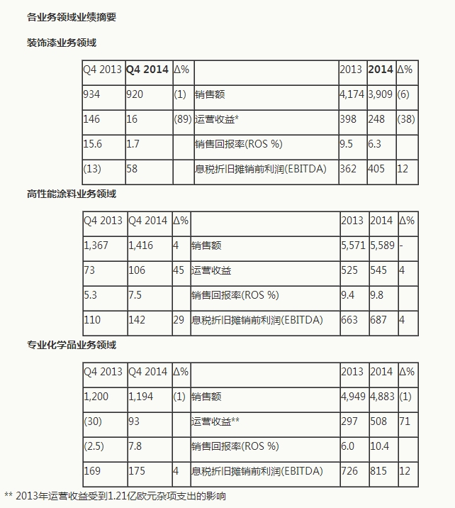 装饰漆业务领域。在欧洲顺利推行了一项新的运营模式。全年销量增长1%,其中亚洲的销量增长最为明显。由于业务剥离,及不利的货币汇率和不利的价格及综合因素影响,销售额相比2013年下降了6%。第四季度销售额下降1%,主要是因为德国门店的出售,抵消了亚洲 3% 的销售额增幅和拉丁美洲6%的销售额增幅。运营业绩有明显改善。