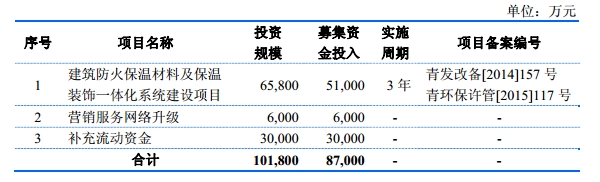 根据招股说明书显示,亚士创能首次募集资金8.7亿元,主要用于“建筑防火保温材料及保温装饰一体化系统建设项目”,投资规模为6.58亿元,集资金投入5.1亿万元;“营销服务网络升级”项目,集资金投入0.6亿元;“补充流动资”项目,集资金投入3亿元。