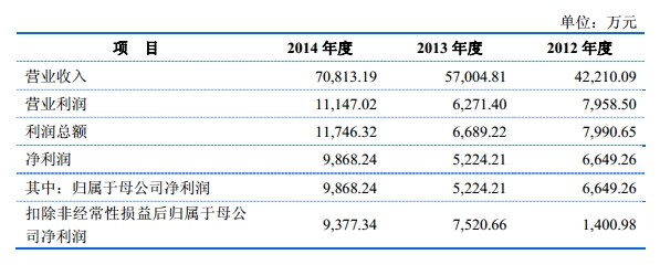 招股说明书显示,亚士创能2012年-2014年实现营业收入分别为4.221亿元、5.700亿元、7.081亿万元;营业利润分别为7958.50万元、6271.40万元、11147.02万元;归属于母公司净利润分别为6649.26万元、5224.21万元、9868.24万元。