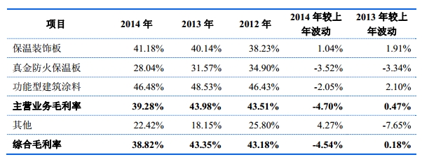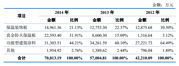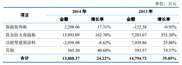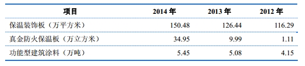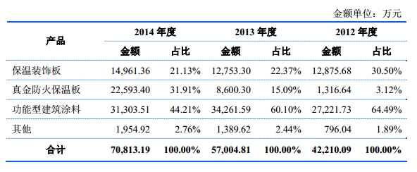 保温材料行业生产厂家众多,竞争较为充分,但由于真金防火保温板有效提升了有机保温材料的防火性能,并凭借国内领先的技术优势,自2012年进入市场以来,销售收入从2012年的约1300万元增加到2014年的约2.2亿元左右,复合增长率超过300%,产品销量在板材类建筑外墙外保温材料生产企业中已名列前茅。