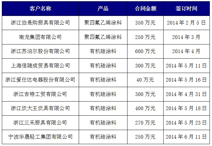 报告期内,公司有机硅涂料合同基本保持去年产量,略有上升,受惠于聚四氟乙烯不粘涂料利好,公司聚四氟乙烯不粘涂料较去年增长了2.81%。
