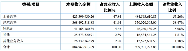 美涂士公司的收入主要包括木器涂料、建筑涂料、粘胶剂以及其他业务收入。公司2014年的销售收入金额比2013年有小幅下降,主要是因为本年市场总体不景气影响。公司本年销售额的下降主要是因为木器涂料和胶粘剂均比2013年有一定的下降,虽然本年建筑涂料的销售有一定的发力,但在总体市场疲软的影响下,本年的总销售收入比上年下降。