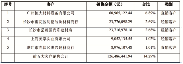 公司现有直销客户如广州恒大材料设备有限公司、苏州金螳螂建筑装饰股份有限公司、广东星艺装饰集团有限公司、北京业之峰诺华装饰股份、森源蒙玛家具有限公司等;有经销客户明德装饰材料商行、德固建筑装饰材料商行等。同时,公司产品已销往印度、黎巴嫩及也门等地区,且已在淘宝及天猫建立销售平台。