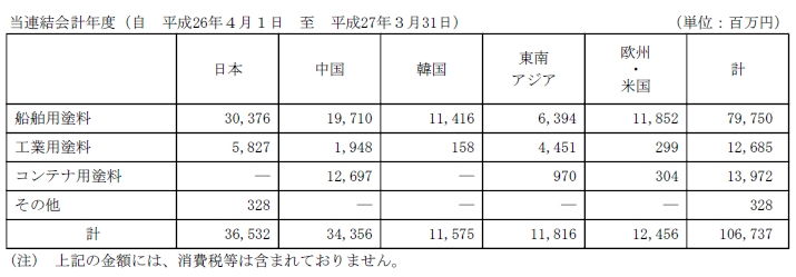 中国涂料株式会社2015财年各国家相关涂料产品销售情况