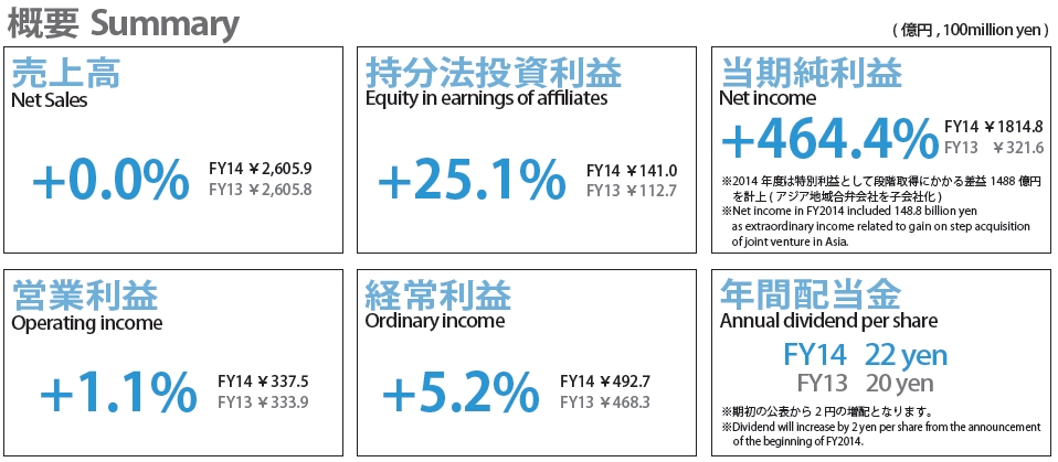 财报称,本公司集团的本期的合并营业利润提高,主要得益于为原材料的成本上升中,持续降低成本的结果。另外,综合净利润方面,亚洲地区的合资公司股权取得子公司化实施的同时,取得了纯利润为1814.77亿日元,同比增长464.4%,主要系差额利益。此外,海外的事业公司除了一些采用12月决算外,本期的对象决算期间是2014年1月至12月。