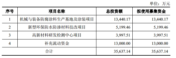 根据募集资金投资项目的可行性研究报告,机械与装备防腐涂料生产基地及涂装项目预计将实现年均销售收入2.22亿元,年均净利润3689.09万元;新型环保防水防渗材料技改项目预计将实现年均销售收入1.39亿元,年均净利润 1801.90万元。本公司将加快推进募投项目建设,争取募投项目早日达产并实现预期效益。