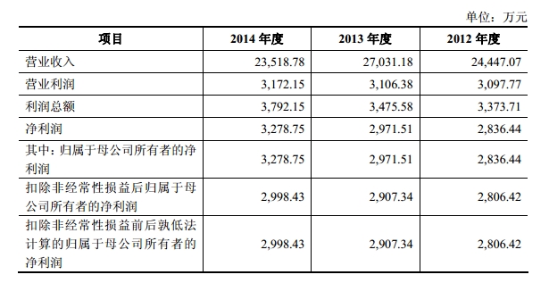 根据招股说明书显示,株洲飞鹿2012年-2014年实现营业收入分别为2.445亿元、2.703亿元、2.352亿元,2014年相比较2013年营业收入下降了12.99%;利润总额分别为3373.71万元、3475.58万元、3792.15万元;净利润分别为2836.44万元、2971.51万元、3278.75万元,2014年相比较2013年净利润增长了10.34%。(如下图)