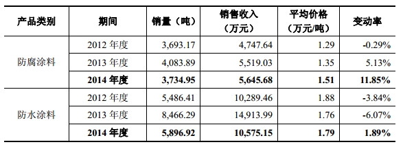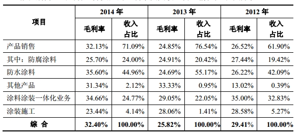 报告期内,公司产品销售业务收入占比超过60%,其毛利率水平对公司整体毛利率影响最大。2013年产品销售毛利率相比2012年下降主要是成本上升幅度大于销售单价上升幅度所致;2014年产品销售毛利率相比2013年有一定上升,一方面是由于2014年材料成本对比2013年有一定幅度下降,另一方面是由于公司防水涂料产品结构变化,销售单价和毛利率较高产品销售占比提升所致。报告期内,涂料涂装一体化业务毛利率相对较高且保持稳定,且其收入占比在25%至30%左右,一定程度提高了公司的总体毛利率。报告期内,公司涂料涂装一体化业务毛利率分别为35.00%、29.05%和34.66%,公司同期综合毛利率分别为29.41%、25.82%和32.40%。