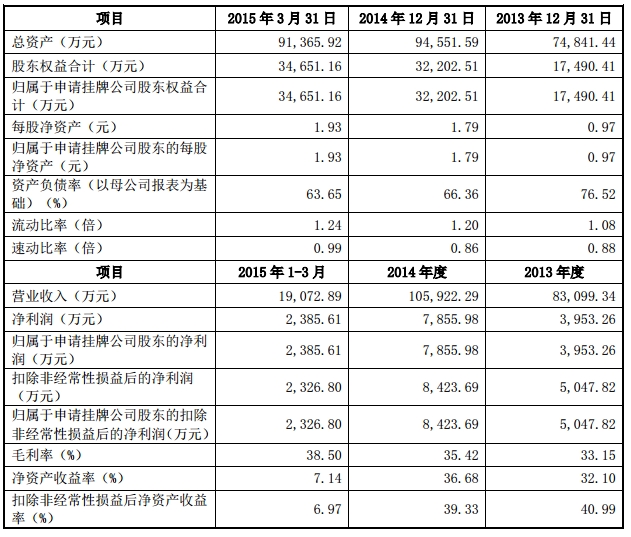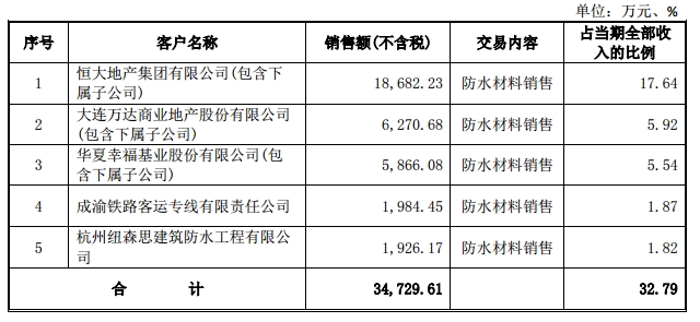 6月26日,科顺防水科技股份有限公司新三板预披露,根据公开转让说明书显示,2013年-2014年实现营业收入分别为8.31亿元、10.59亿元,净利润分别为3953.26万元、7855.98万元。其中,2013年防水涂料营业收入为2.003亿元,占营业收入总额的24.13%;2014年防水涂料营业收入为2.303亿元,占营业收入总额的21.76%。