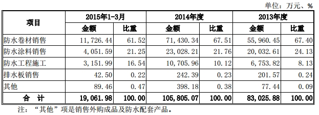 报告期内公司的营业收入包括防水卷材销售、防水涂料销售、防水工程施工和排水板销售等,其中防水卷材和防水涂料销售收入合计占相应期间主营业务收入的比例分别为91.53%、89.27%和82.77%,详见下表: