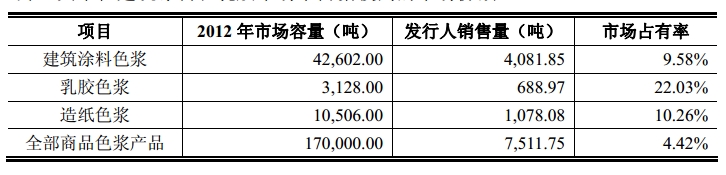 公司产品销量一直保持着较高的增长速度,市场占有率和行业地位稳步上升,其中在建筑涂料和乳胶市场中占据较高的市场份额。(如下表)