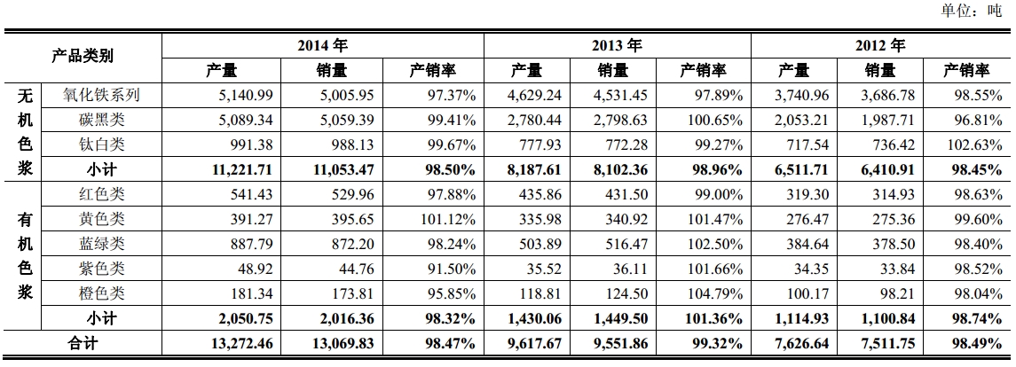 报告期内,公司主要色浆产品产量、销量及产销率情况如下: