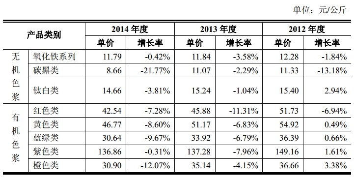 世名科技在其招股说明书中表示,公司在生产经营过程中面临下游行业市场需求增幅降低风险。世名科技表示,公司主营业务为色浆的研发、生产和销售,主要产品为环保型、超细化水性色浆。经过多年的发展,公司已经成为国内色浆行业的龙头企业、商品化色浆的领导者,产品广泛应用于涂料、乳胶、造纸、纺织、皮革、墨水等多个行业,在建筑涂料色浆、乳胶色浆和造纸色浆等细分市场处于领先地位。2012-2014年,水性色浆销售收入占公司主营业务收入的比例分别为97.90%和96.98%和96.03%。