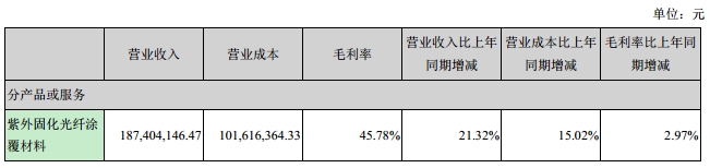 报告期内,飞凯材料紫外固化光纤涂覆材料实现销售收入1.87亿元,较上年同期增长21.32%,继续扩大紫外固化光纤光缆涂覆材料在国内市场的份额。