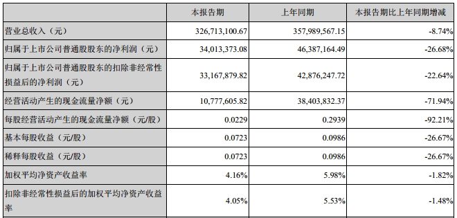 报告期内公司基本每股收益为0.0723元,较上年同期的0.0986元减少26.67%;主要原因是报告期公司净利润有所下降所致。加权平均净资产收益率为4.16%,较上年同期下降1.82个百分点,主要原因是报告期公司净利润同比减少所致。