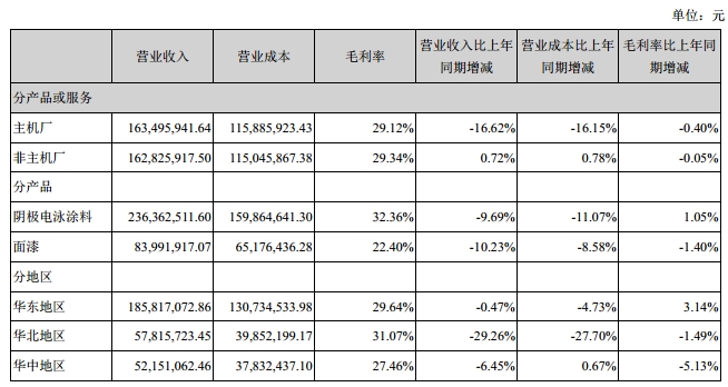 报告期内,公司未发生丢失主要汽车主机厂客户的情况。公司带领员工加快技术进步,优化产品性能,提高现场技术服务水平,同时,公司加大了汽车原厂涂料以外的业务拓展力度,推进工业用阴极电泳涂料、工程机械面漆、农用机械涂料、摩托车涂料、汽配涂料、陶瓷涂料等业务的开发。报告期内公司营业总收入同比减少8.74%。报告期内公司产品毛利率同比下降0.21个百分点,与去年同期相比基本持平。