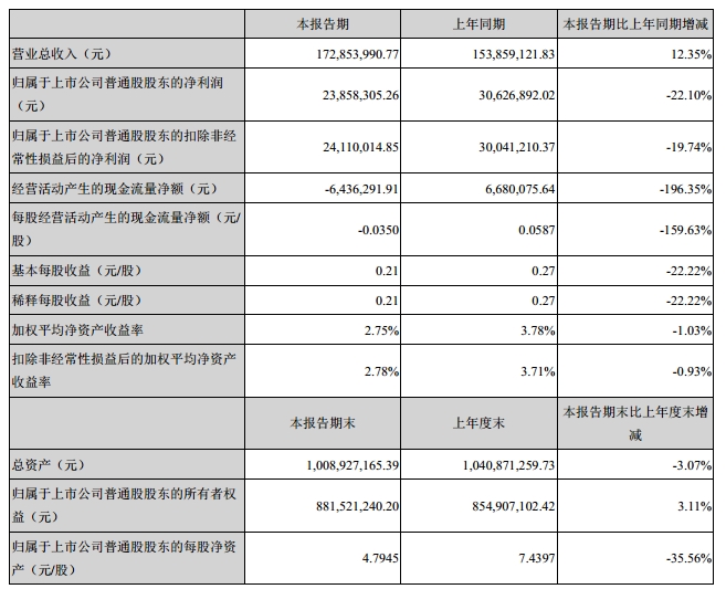 上海新阳(300236)8月26日发布上半年报告,公司实现营业收入17285.40万元,比上年同期增长12.35%,归属于上市公司股东的净利润为2385.83万元,比上年同期下降22.10%。