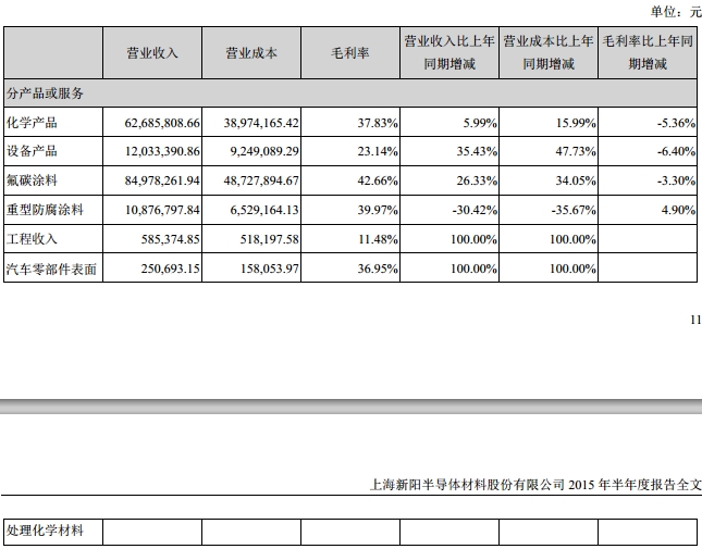 报告称,母公司设备产品比上年同期收入增长35.43%,主要原因是上半年接到的设备订单增加,销售上升所致;主营业务重型防腐涂料比上年同期下降30.42%,主要原因是销售订单减少所致;主营业务产品比上年同期增加工程收入,主要原因是子公司工程完工实现收入所致;主营业务产品比上年同期增加汽车零部件表面处理化学材料产品,主要原因是子公司上海新阳海斯高科技材料有限公司本报告期实现收入所致。