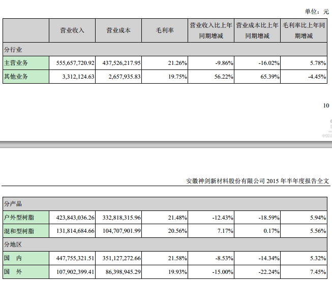 神剑股份(002361)8月24日晚发布半年报称,公司围绕年度目标开展各项工作,由于原材料价格低位运行,上半年实现营业收入5.59亿元,同比下降9.64%;净利润5194.06万元,同比增长35.43%。户外型树脂实现销售收入42,384.30万元,占主营业务收入76.28%;混和型树脂实现销售收入13,181.47万元,占主营业务收入23.72%。