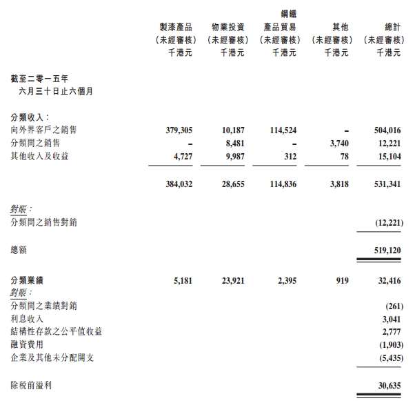 报告显示,期内收入约为3.7931亿港元,较去年同期减少19.9%。制漆产品之销售下跌,主要是由于香港及中国内地之经济放缓导致制漆产品之需求减少所致。尽管毛利率较去年同期略有改善,但销售显著下跌令毛利显著减少,分类溢利因此大幅减少至约518万港元,较去年同期减少约85.9%。