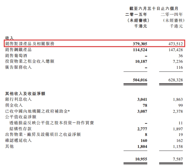 本集团录得收入约5.0402亿港元,较去年同期减少19.8%。本集团期内的毛利较去年同期减少13.7%至约1.4648亿港元;本集团之核心业务仍为制造及销售制漆产品,于回顾期间为本集团总收入贡献约75.3%。