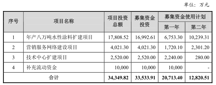 招股书显示,公司募集资金拟投资于年产八万吨水性涂料扩建项目、营销服务网络建设项目、技术中心扩建项目及补充流动资金项目。本次募集资金投资项目围绕公司主营业务进行,目的在于提升公司现有主导产品的生产及销售规模。