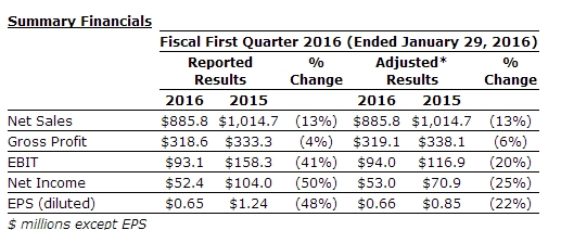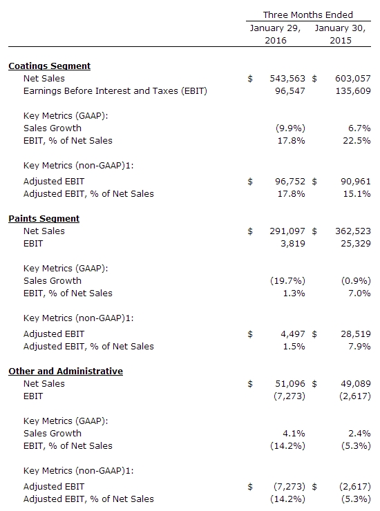 2月28日,美国威士伯公司(Valspar)公布2016财年首季度财务报告,公司净销售额达8.858亿美元,同比下降13%,并购效应增加销售额3%,并增加销售量2%,但不利的货币汇率拉低销售额6%,首季度公司净利润5240万美元,同比下降50%。