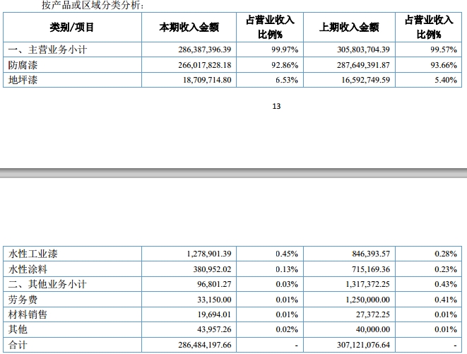 按产品或区域分类来看:防腐漆销售额占比92.86%,为2.660亿元;地坪漆销售额占比6.53%,为1870.97万元,水性工业漆销售额占比0.45%,为127.89万元;水性涂料销售额占比0.13%;为38.095万元。