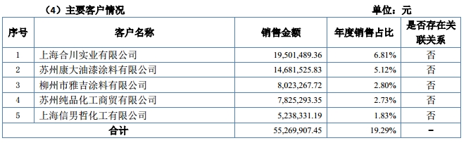 报告期内,公司客户主要为油漆涂料行业的经销商和油漆涂料使用的直销客户。其中前五大客户为上海合川实业有限公司、苏州康大油漆涂料有限公司、柳州市雅吉涂料有限公司、苏州纯品化工商贸有限公司、上海信男哲化工有限公司。前五名客户收入合计占公司合并收入的比例为19.29%。客户主要集中在以苏州、上海为中心的华东地区。