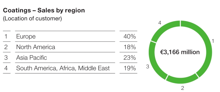报告显示,巴斯夫2015年涂料销售额31.66 亿欧元(2014年:29.84亿欧元),约合人民币224.539亿元,同比增长6%。其中欧洲占比40%,北美占比18%,亚洲占比23%(约51.644亿元),南美、非洲、中东占比19%。(2015年12月31日欧元对人民币汇率:1欧元=7.0922人民币)