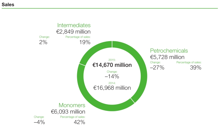 化学品业务领域全年销售额为147亿欧元,较去年下降14%。原材料成本的降低导致了产品价格下跌,是影响销售额的主要原因,石油化学品部尤其如此。化学品业务领域全年不计特殊项目的息税前收益为22亿欧元,比2014年减少2.11亿欧元。