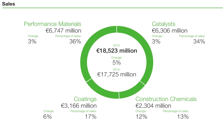 功能性材料与解决方案业务领域全年的销售额上涨5%达到185亿欧元。全年不计特殊项目的息税前收益增长4.52亿欧元,达到16亿欧元,主要由于特性材料业务部与化学建材业务部收益的大幅增长。