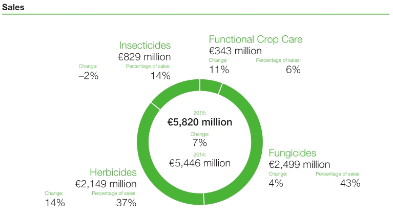 农业解决方案业务领域2015全年销售额达到58亿欧元,较2014年上涨7%。不计特殊项目的息税前收益为11亿欧元,达到前一年水平(下降2%)。