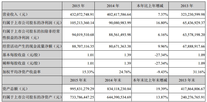 据了解,该公司核心产品紫外固化光纤光缆涂覆材料主要面向光纤光缆生产企业。随着 FTTH、HDTV、三网合一、物联网等技术的发展,全球以及我国对光纤的需求量越来越大。光纤光缆市场的持续增长带动了公司业绩迅速增长,公司营业收入从2013年的3.232亿元增长到2015年的4.321亿元,增加了33.67%,同期净利润从6543.69万元增长至1.052亿元,增加了60.79%。