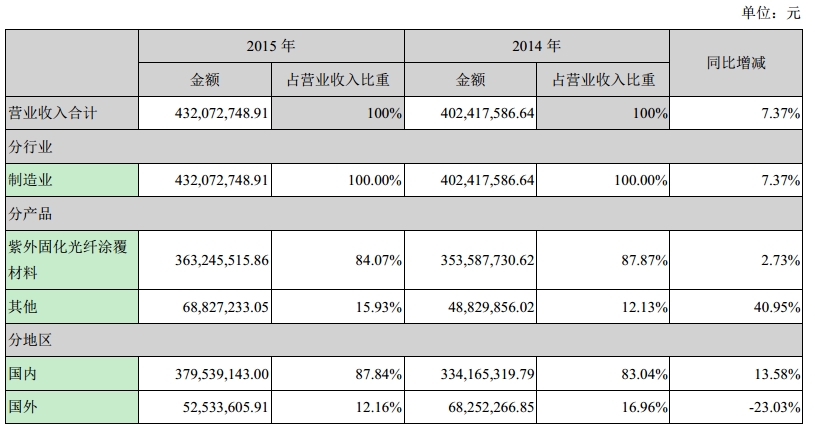 报告期内,公司所面对的光通信市场由于4G、3G网络建设需求的增加、宽带网络建设的持续投入、农村信息化建设、提高网速等国家信息化战略带动等背景持续发展,公司响应市场需求,继续保持紫外固化光纤光缆涂覆材料的核心竞争力,不断巩固和开拓销售市场,销量稳中有增。