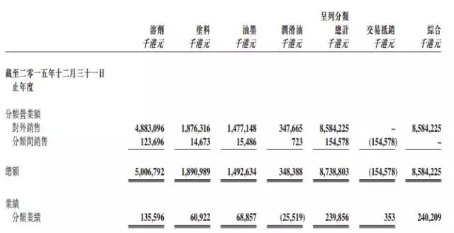 油墨业务于回顾期内的表现与涂料业务类似,同样因受累于原材料及产品售价下跌,令销售额降低10%至14.926亿港元,但受惠于毛利率增加2.8个百分点,经营利润则增加23%至6885.70万港元。