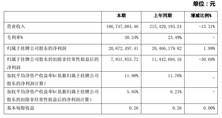 3月19日,中航新材(430056)发布2015年度报告,报告期内实现销售收入18675万元,同比下降13.31%;利润总额2353万元,同比增长0.38%;实现净利润2087万元,同比增长1.95%。