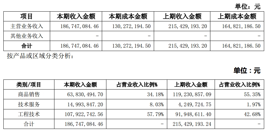 报告期内涂料产品销售收入6383万元,同比下降46.46%,主要原因是天津子公司生产基地开始试运行,在营运初期生产及供货受到影响所致;报告期内工程及技术服务实现收入12292万元,同比增长27.78%,变动的主要原因是技术服务收入增长所致。