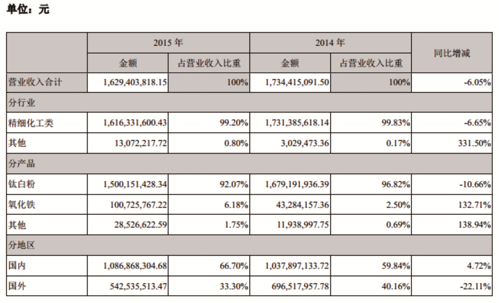 报告显示,2015年,公司生产钛白粉17.24万吨,同比增长4.8%;钛白粉销售15.86万吨,同比增长0.25%;销售氧化铁2.02万吨,同比增长4.19%,较好地完成年度生产销售任务。