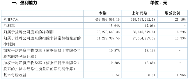 3月31日,美佳新材(831053)发布2015年报,报告期内实现营业收入4.599亿元,同比增长21.16%;净利润为3327.86万元,同比增长16.29%。报告期内,公司实施了两次非公开发行,募集资金合计1.2亿。