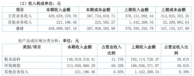 美佳新材称,报告期内受原材料价格下降影响,公司的粉末涂料产品售价随着下降,虽然公司粉末涂料产品销量并未下降,但由于单价下降,导致其销售收入下降了4609.52 万元;随着新厂区生产的二步法环氧树脂正式投入生产,公司环氧树脂产能充分释放,产销量大幅提升,从而使得环氧树脂销售收入大幅提高,同比增长68.20%。